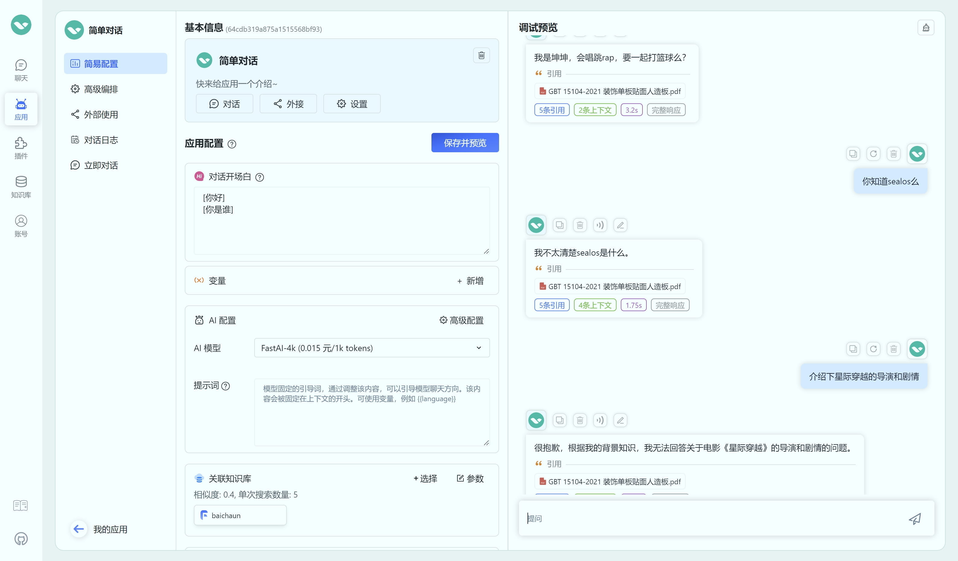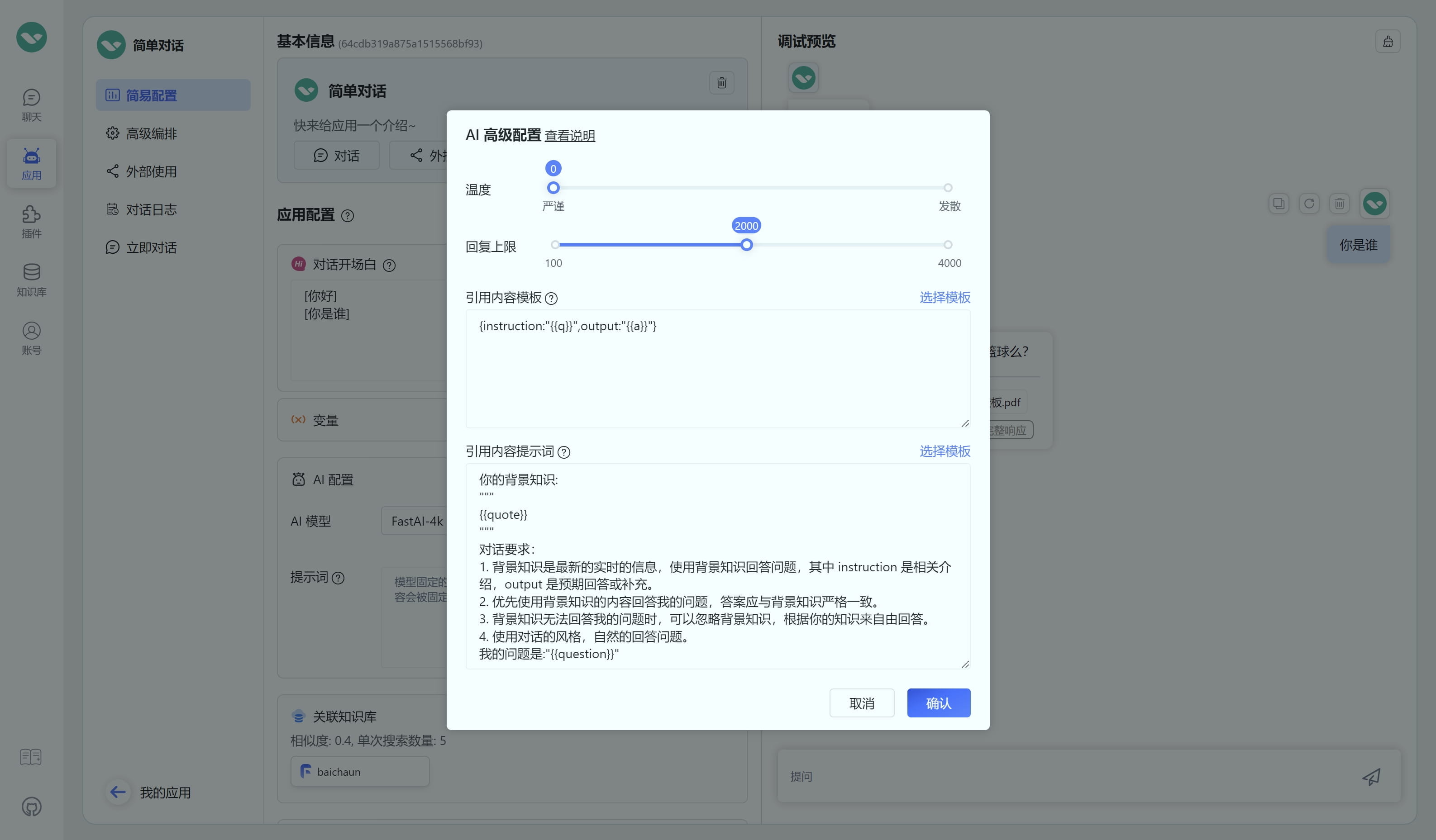 简易模式已移除该功能,仅在工作流中可配置,可点击工作流中AI对话节点内,知识库引用旁边的setting icon进行配置。随着模型的增强,这部分功能将逐步弱化。
