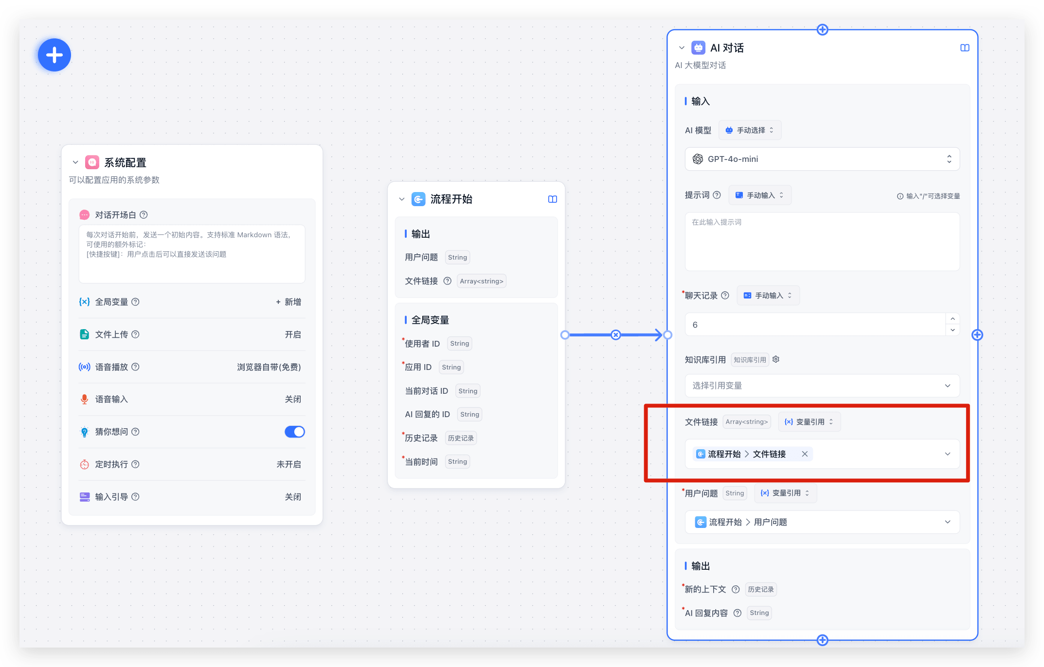 在 AI 节点(AI对话/工具调用)中,新增了一个文档链接的输入,可以直接引用文档的地址,从而实现文档内容的引用。