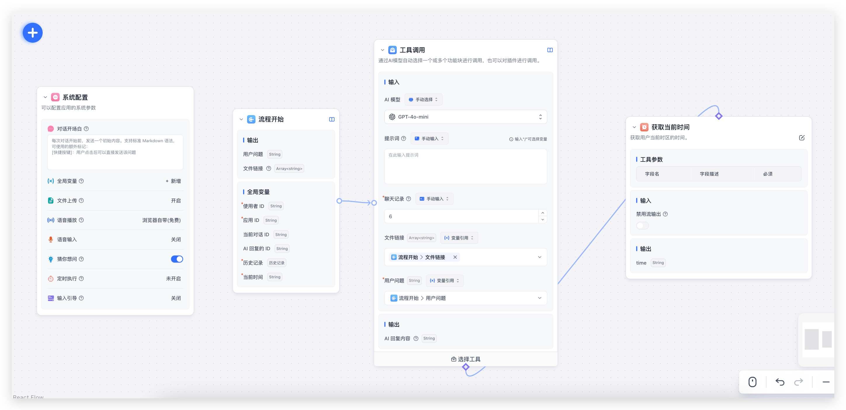 在工作流中,使用文件的方式很多,最简单的就是类似下图中,直接通过工具调用接入文档解析,实现和简易模式一样的效果。