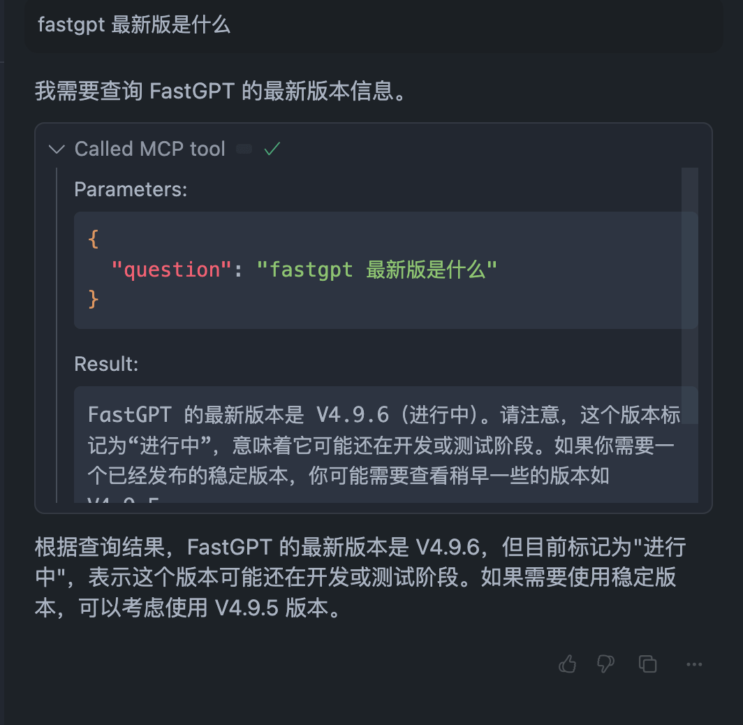 发送一个关于fastgpt的问题后,可以看到,cursor 调用了一个 MCP 工具(描述为:查询 fastgpt 知识库),也就是调用 FastGPT 应用去进行处理该问题,并返回了结果。