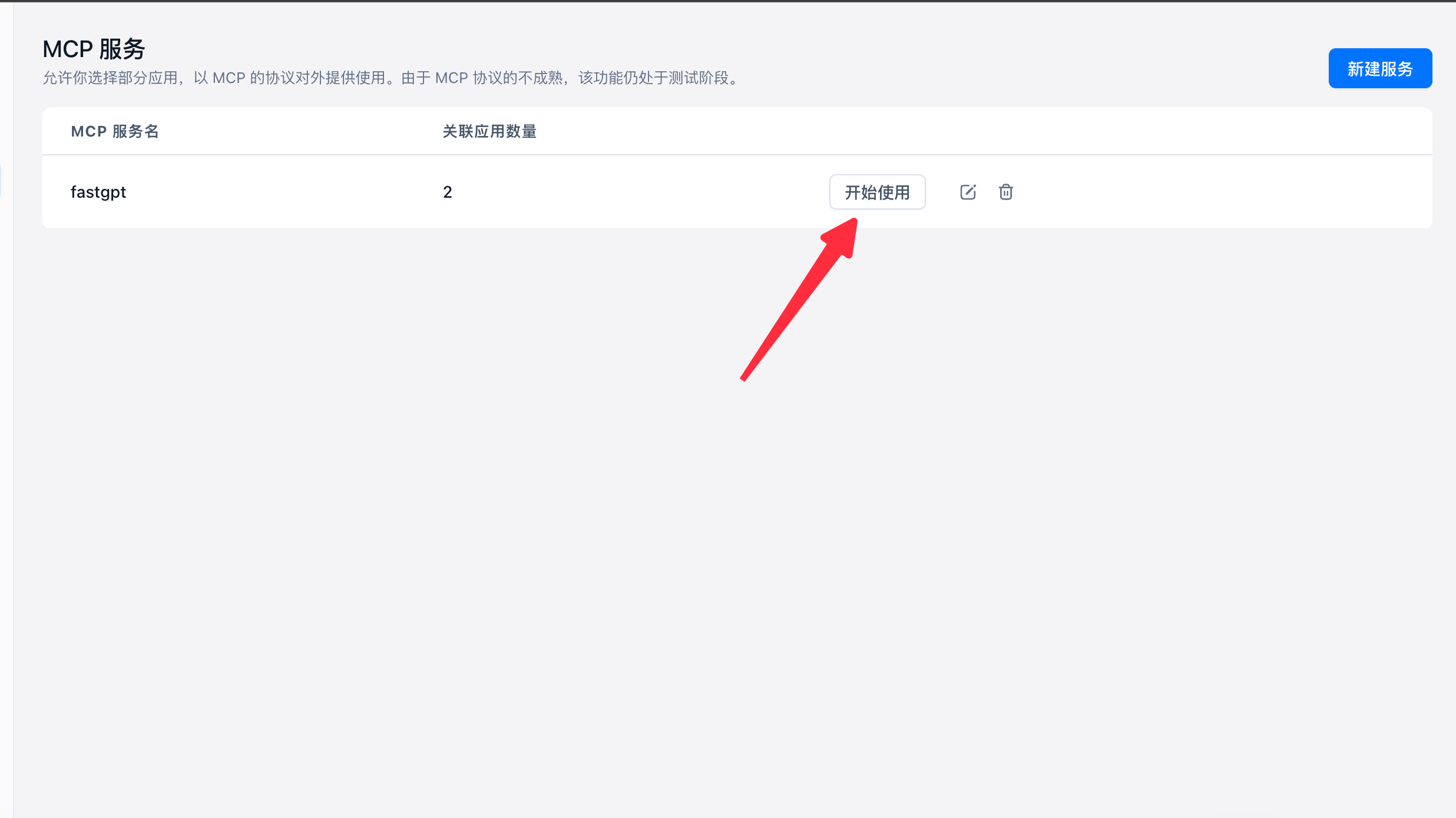 登录 FastGPT 后,打开工作台,点击MCP server,即可进入管理页面,这里可以看到你创建的所有 MCP server,以及他们管理的应用数量。