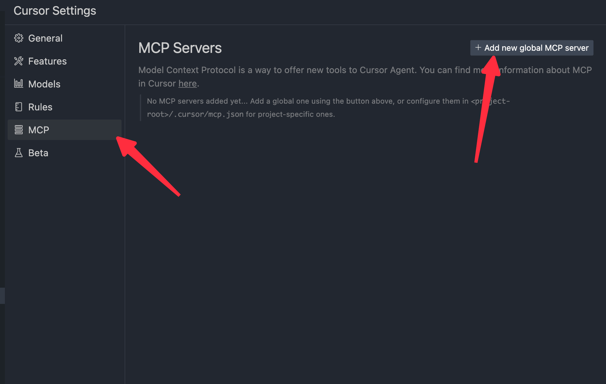 打开 Cursor 配置页面,点击 MCP 即可进入 MCP 配置页面,可以点击新建 MCP server 按钮,会跳转到一个 JSON 配置文件,将第二步的接入脚本复制到json 文件中,保存文件。