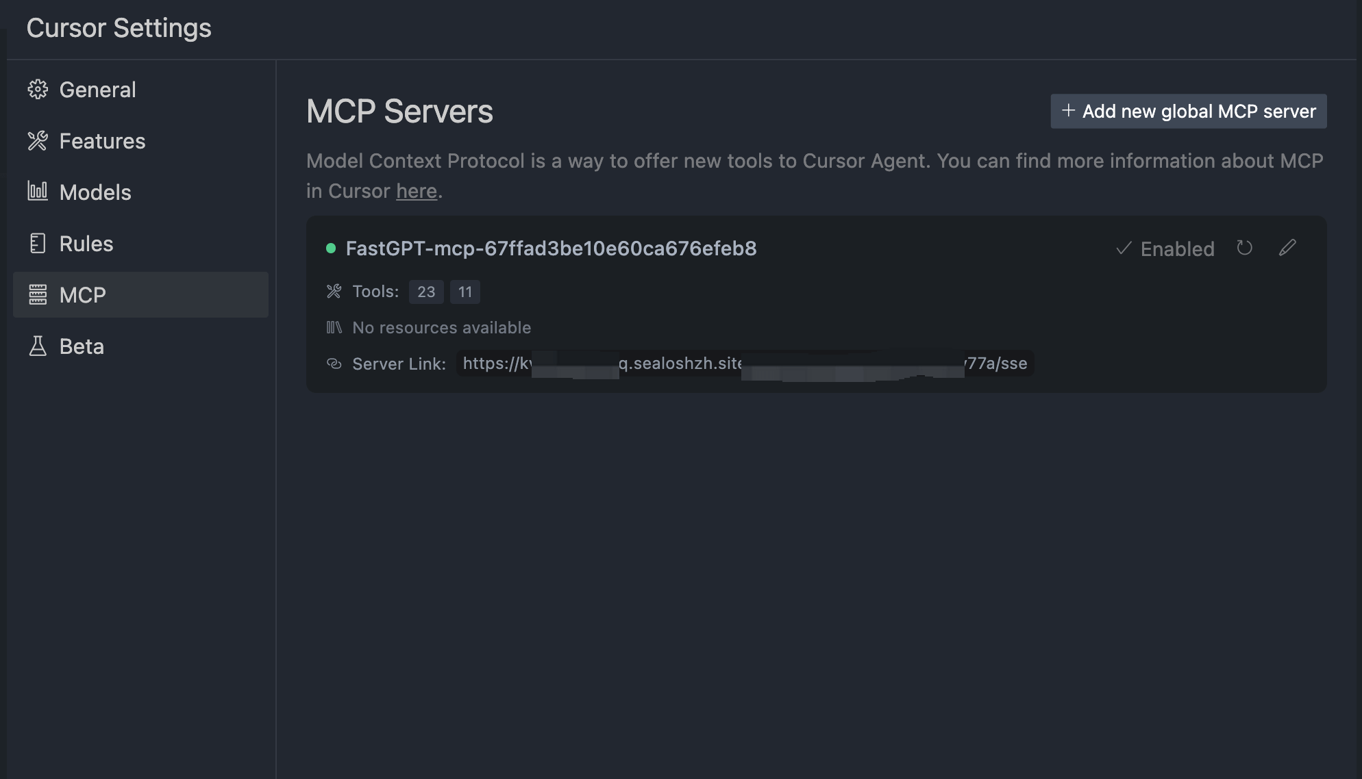 此时返回 Cursor 的 MCP 管理页面,即可看到你创建的 MCP server,记得设成enabled状态。