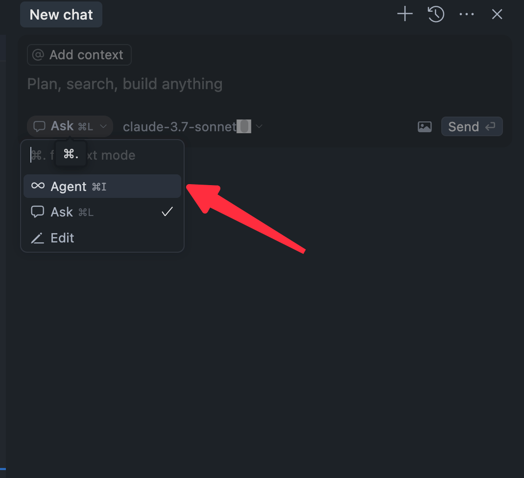 打开 Cursor 的对话框,切换成Agent模型,只有这个模型,cursor 才会调用 MCP server。