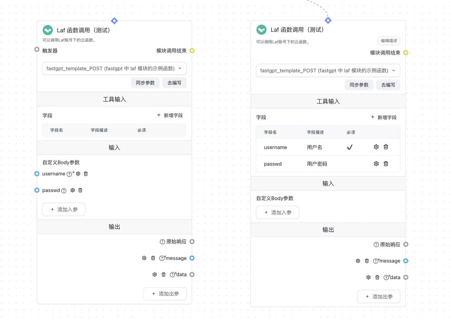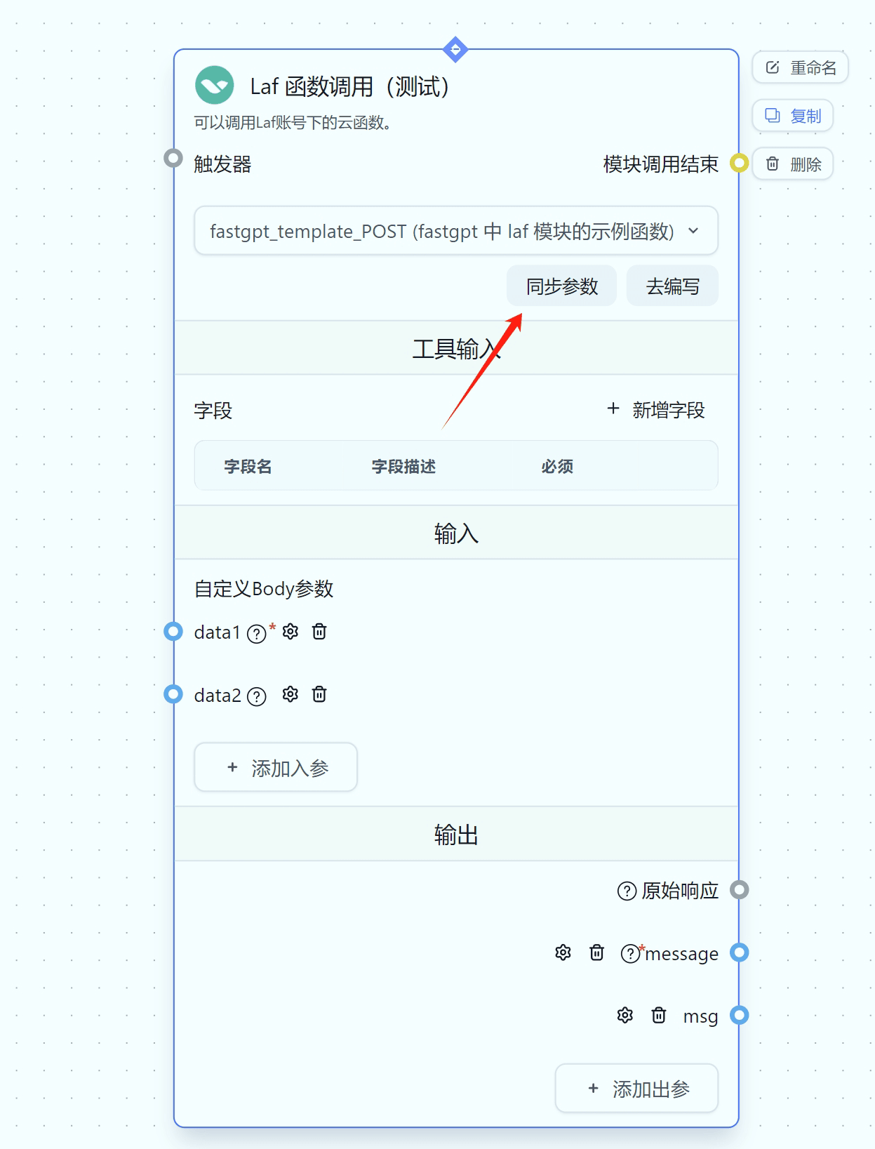 在选择函数后,可以通过点击“同步参数”,自动同步云函数的参数到 FastGPT 中。当然也可以手动添加,手动修改后的参数不会被“同步参数”修改。