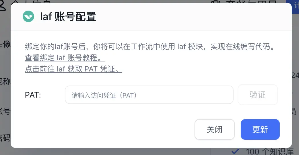 在获取到 PAT 后,我们可以进入 FastGPT 的账号页或是在高级编排中的 Laf模块 对 Laf 账号进行绑定。Laf 账号是团队共享的,仅团队管理员可配置。