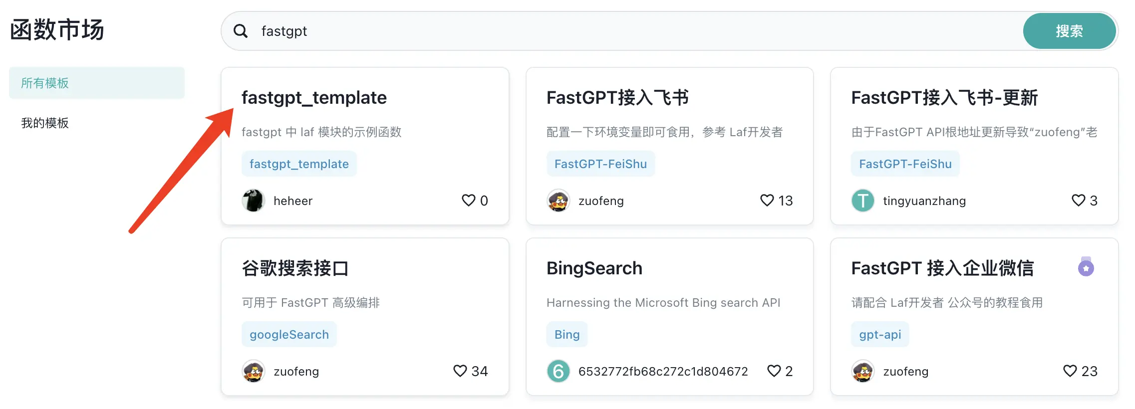 具体操作可以是,进入 Laf 的函数页面,新建函数(注意 fastgpt 只会调用 post 请求的函数),然后复制上面的代码或者点击更多模板搜索“fastgpt”,使用下面的模板