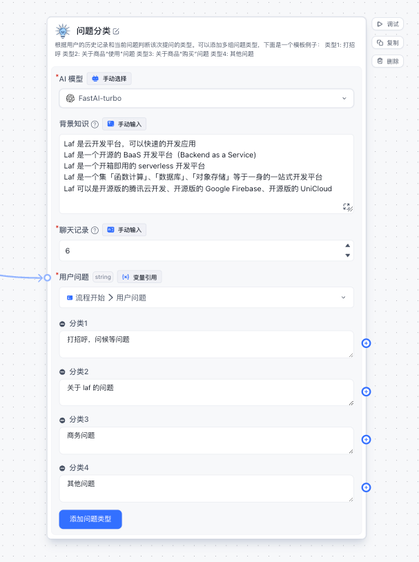 description: `打招呼,返回: abc;Laf 常见问题,返回:vvv;其他问题,返回:aaa`