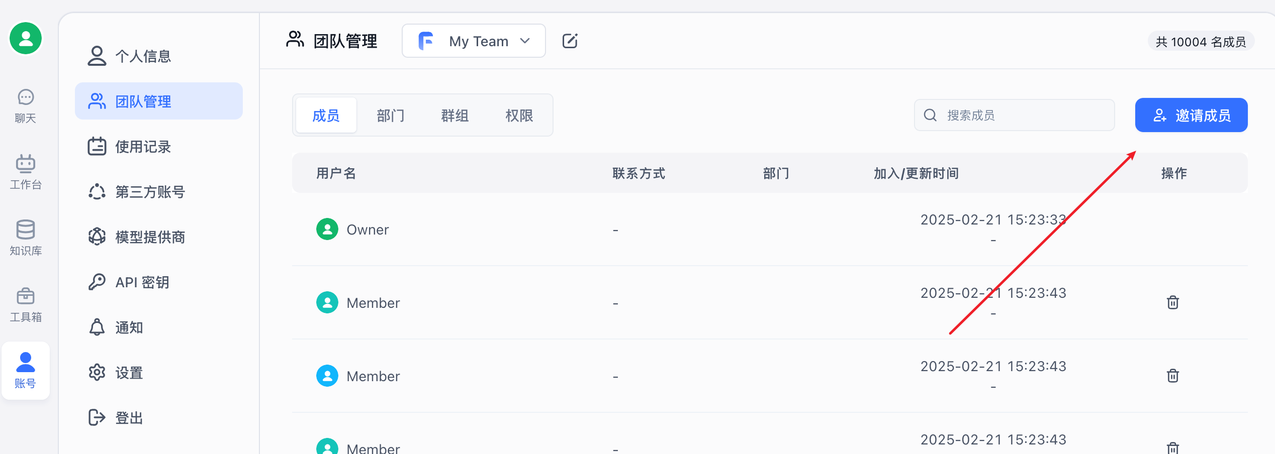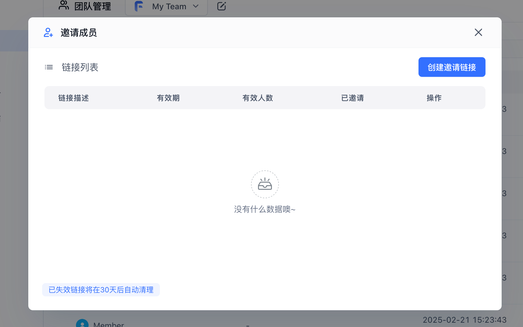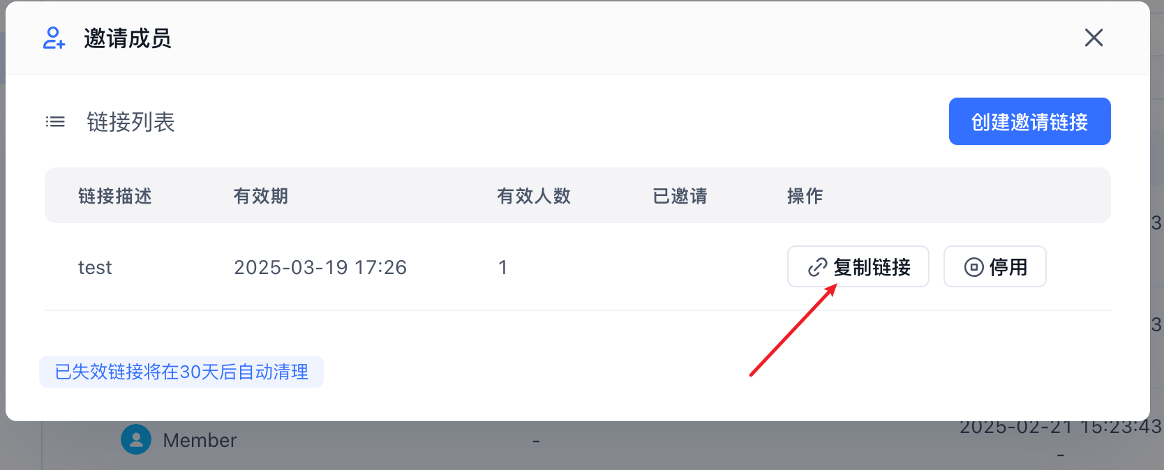 1. 在团队管理页面,管理员可点击「邀请成员」按钮打开邀请成员弹窗