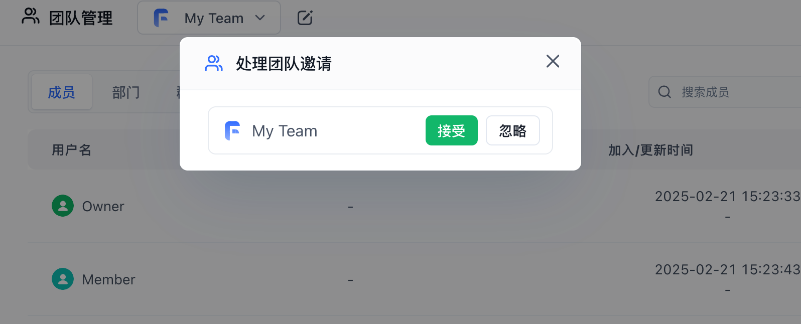 点击忽略,则关闭弹窗,用户下次访问该邀请链接则还可以选择加入。