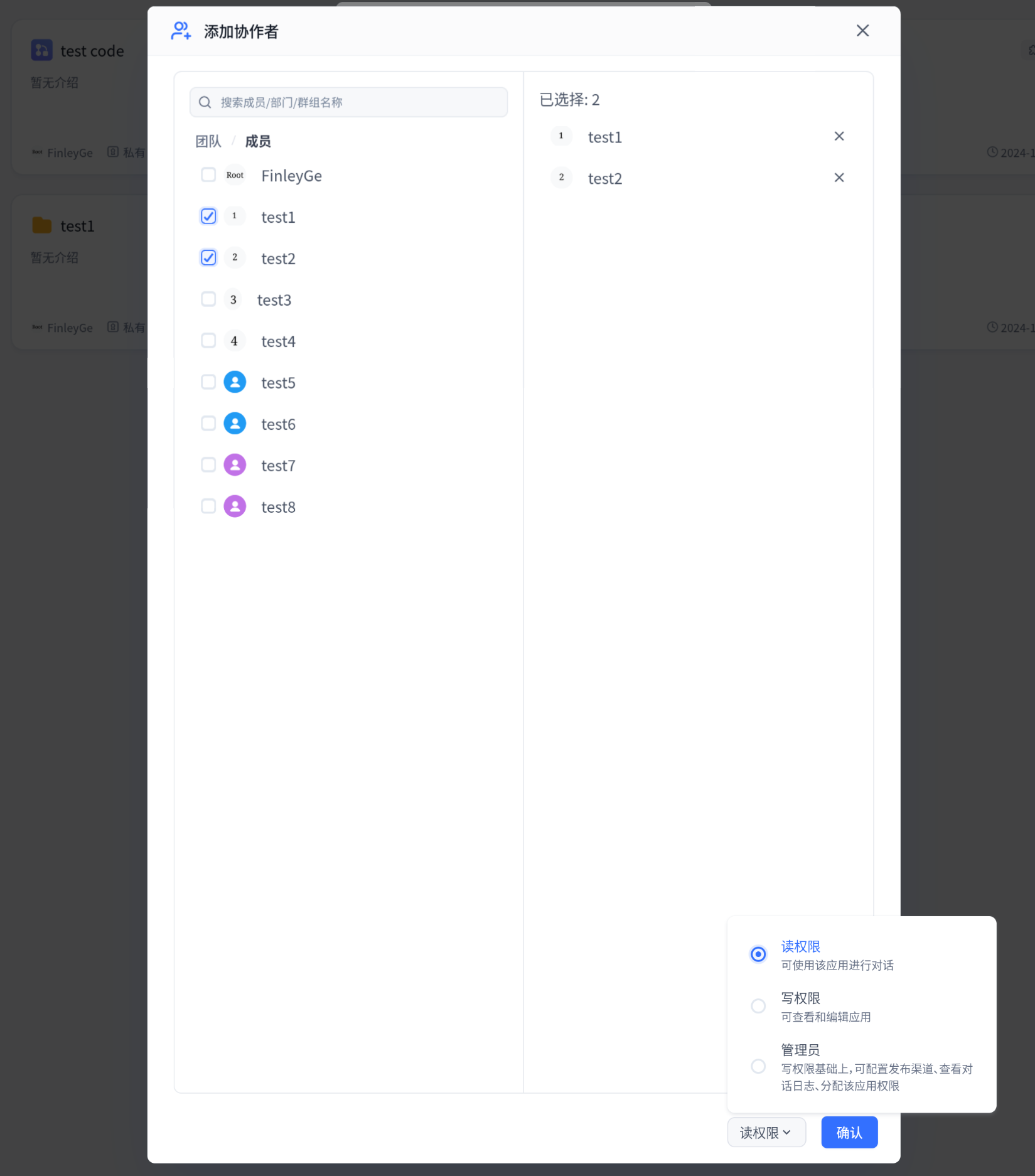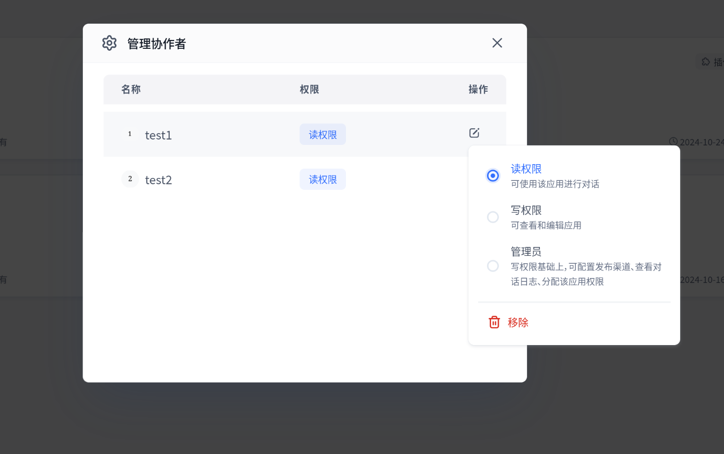 对于应用和知识库等资源,可直接修改成员权限。