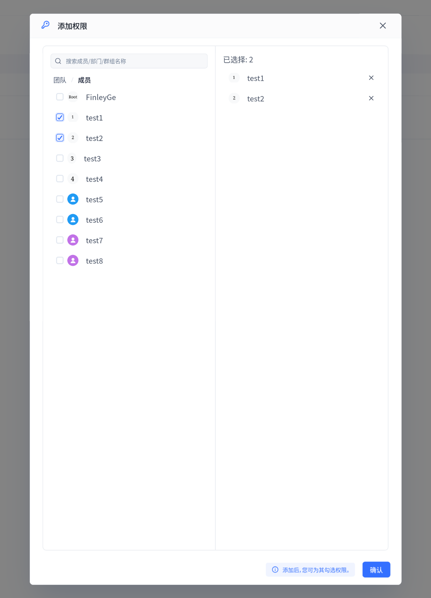 管理团队权限时,需先选择成员/组织/群组,再进行权限配置。