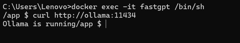 在安装完成后,需要进行检测测试,首先进入 FastGPT 所在的容器,尝试访问自己的 Ollama ,命令如下: