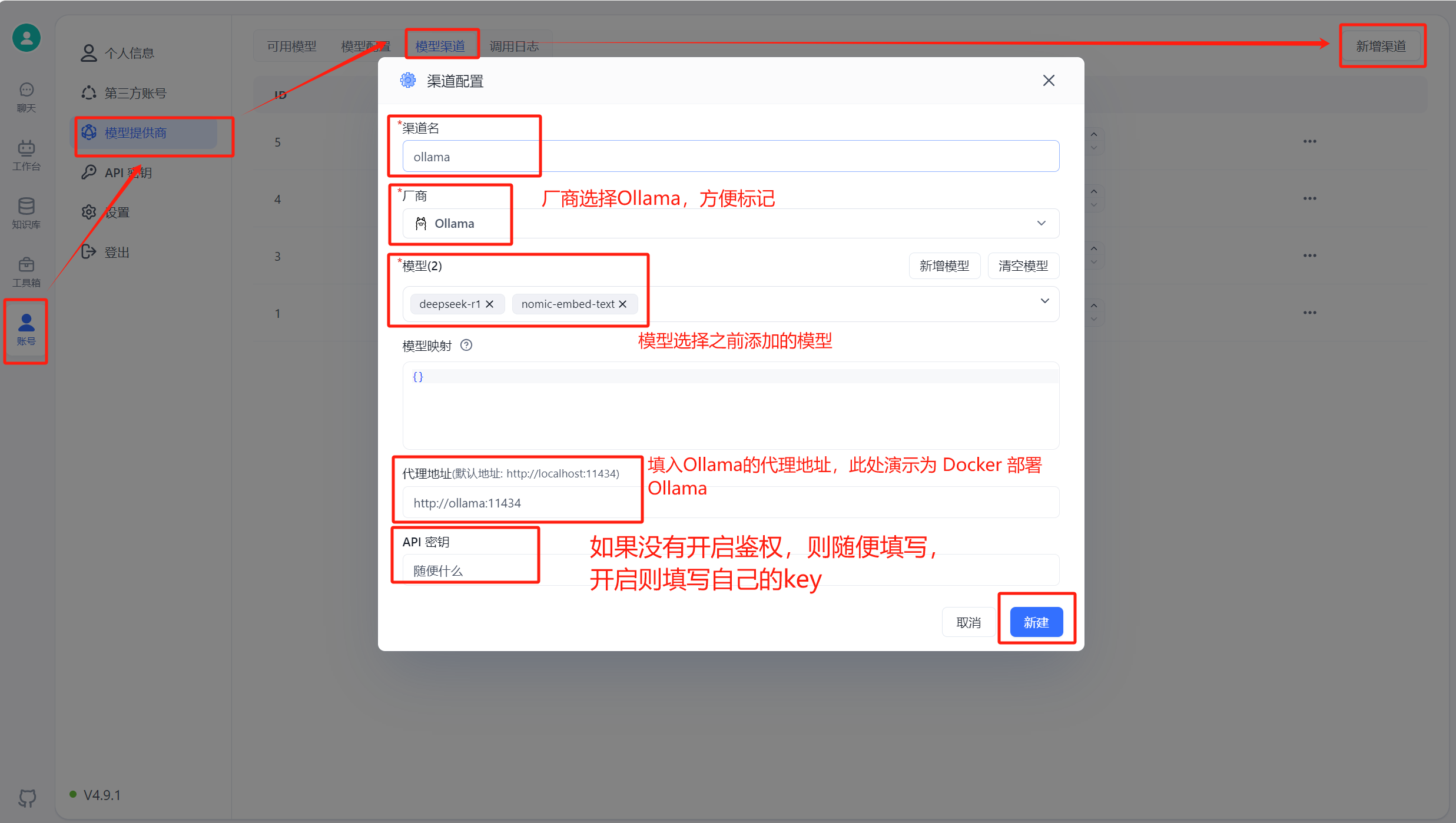 运行 FastGPT ,在页面中选择账号->模型提供商->模型渠道->新增渠道。之后,在渠道选择中选择 Ollama ,然后加入自己拉取的模型,填入代理地址,如果是容器中安装 Ollama ,代理地址为http://地址:端口,补充:容器部署地址为“http://[容器名]:[端口]”,主机安装地址为"http://[主机IP]:[端口]",主机IP不可为localhost