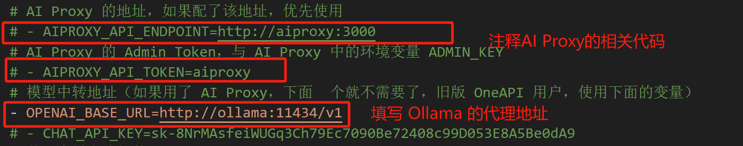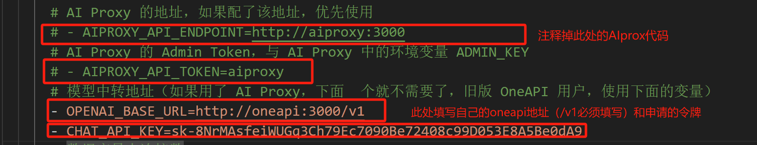 修改部署 FastGPT 的 docker-compose.yml 文件,在其中将 AI Proxy 的使用注释,在 OPENAI_BASE_URL 中加入自己的 OneAPI 开放地址,默认是http://地址:端口/v1,v1必须填写。KEY 中填写自己在 OneAPI 的令牌。