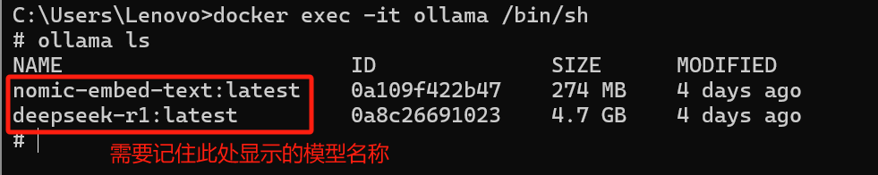 # Docker 部署需要先进容器,命令为: docker exec -it [ Ollama 容器名 ] /bin/sh