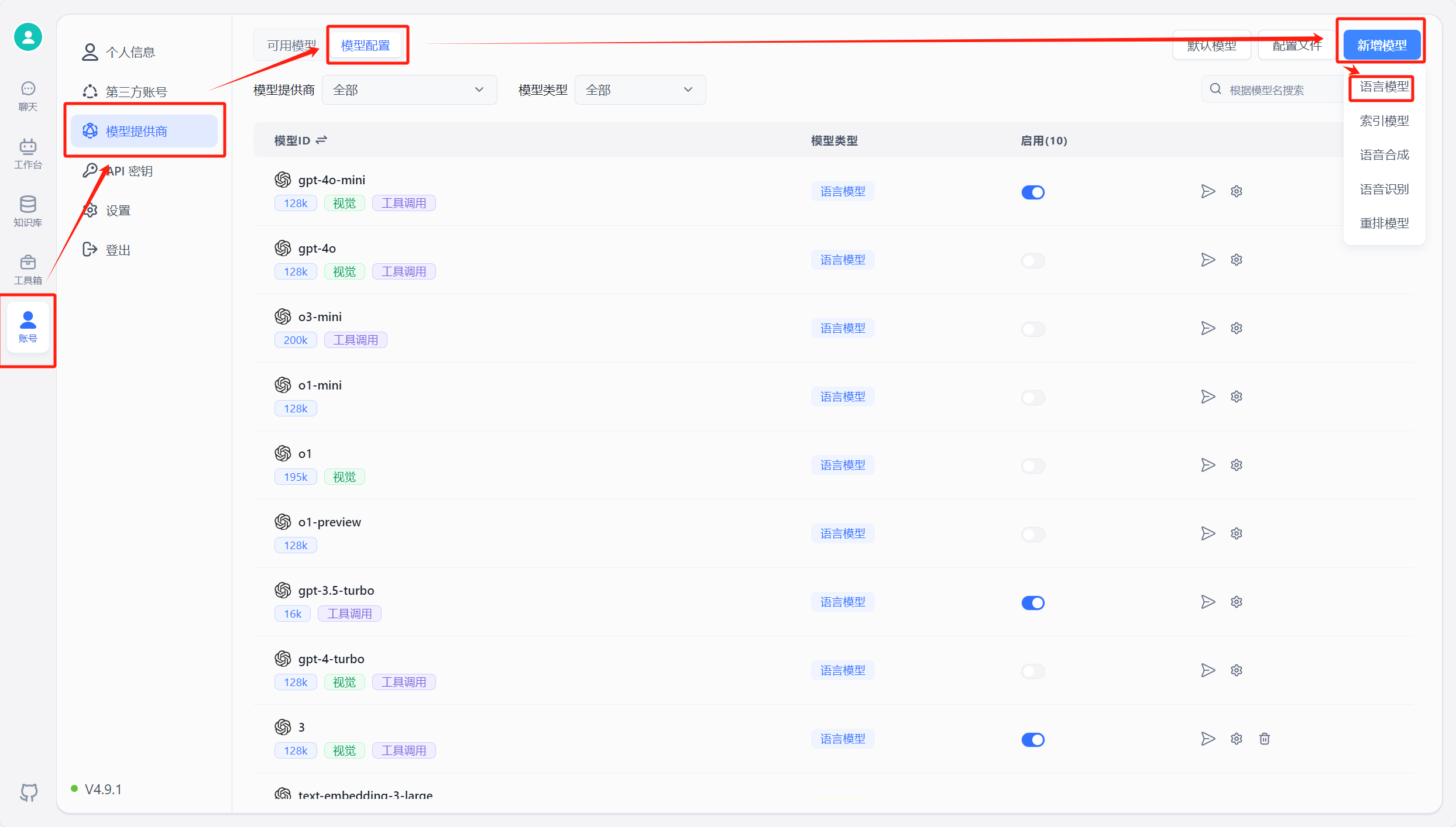 在 FastGPT 中点击账号->模型提供商->模型配置->新增模型,添加自己的模型即可,添加模型时需要保证模型ID和 OneAPI 中的模型名称一致。