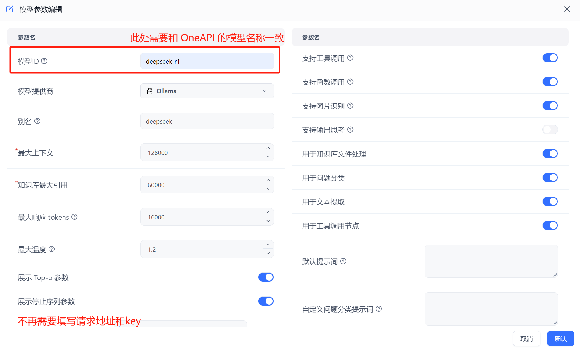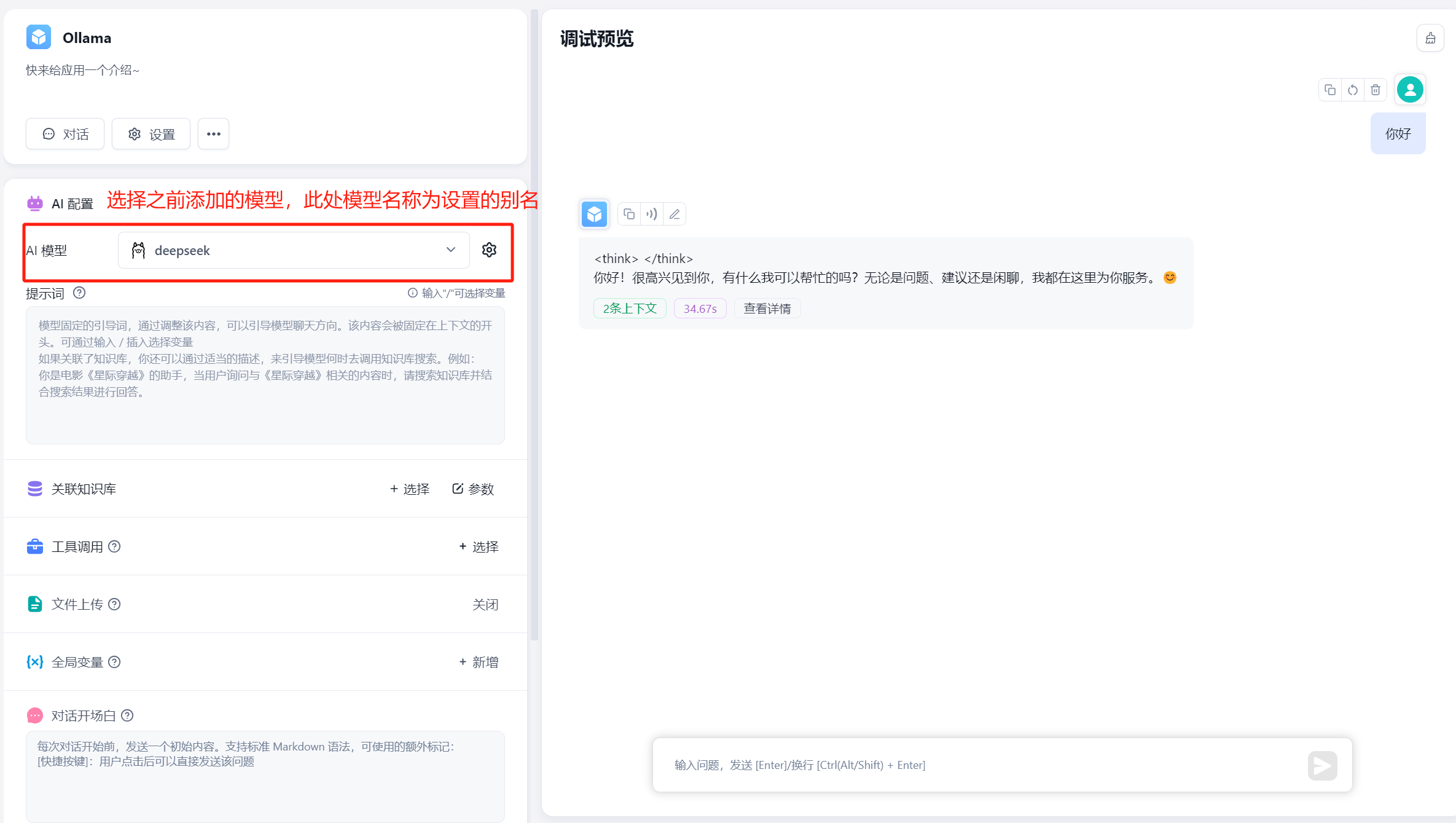上述接入 Ollama 的代理地址中,主机安装 Ollama 的地址为“http://[主机IP]:[端口]”,容器部署 Ollama 地址为“http://[容器名]:[端口]”