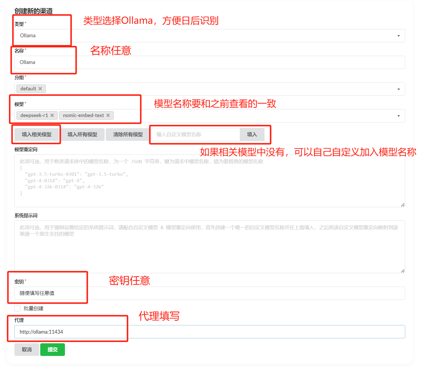 docker run -it --network [ FastGPT 网络 ] --name 容器名 intel/oneapi-hpckit /bin/bash进入 OneAPI 页面,添加新的渠道,类型选择 Ollama ,在模型中填入自己 Ollama 中的模型,需要保证添加的模型名称和 Ollama 中一致,再在下方填入自己的 Ollama 代理地址,默认http://地址:端口,不需要填写/v1。添加成功后在 OneAPI 进行渠道测试,测试成功则说明添加成功。此处演示采用的是 Docker 部署 Ollama 的效果,主机 Ollama需要修改代理地址为http://[主机IP]:[端口]