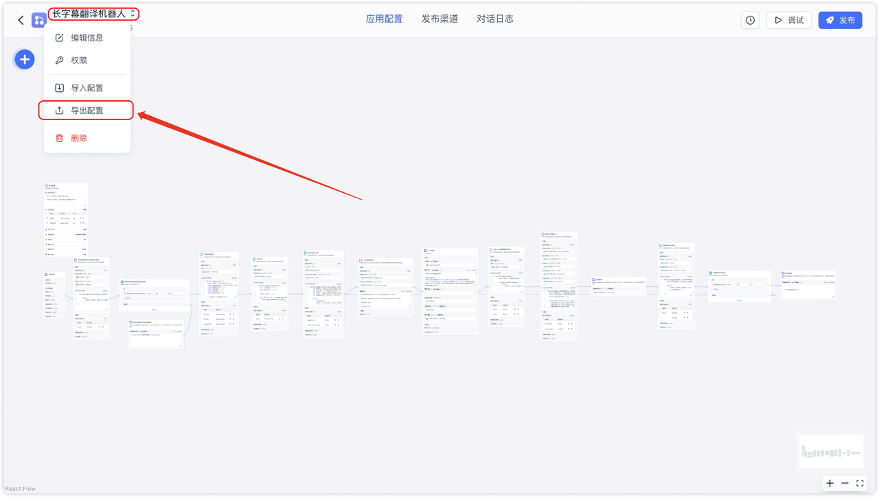 鼠标放置在左上角应用的头像和名称上,会出现对于下拉框操作,可以导出工作流配置。