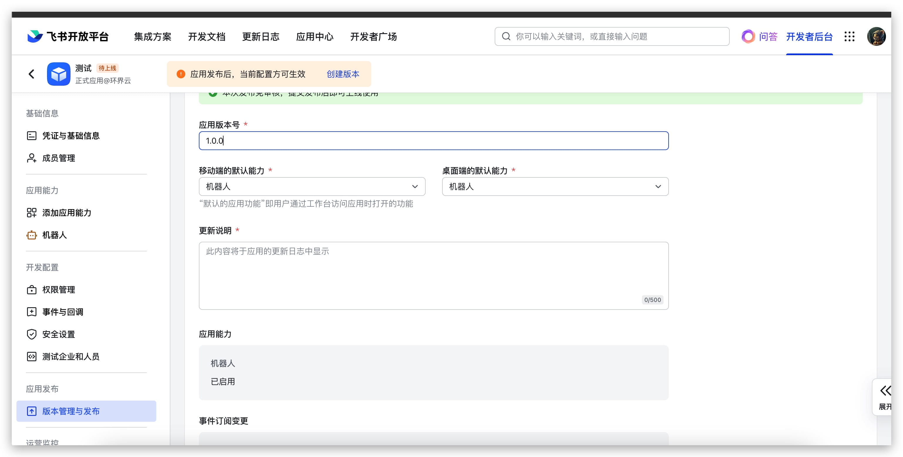 点击飞书控制台左侧的版本管理与发布,即可发布机器人。