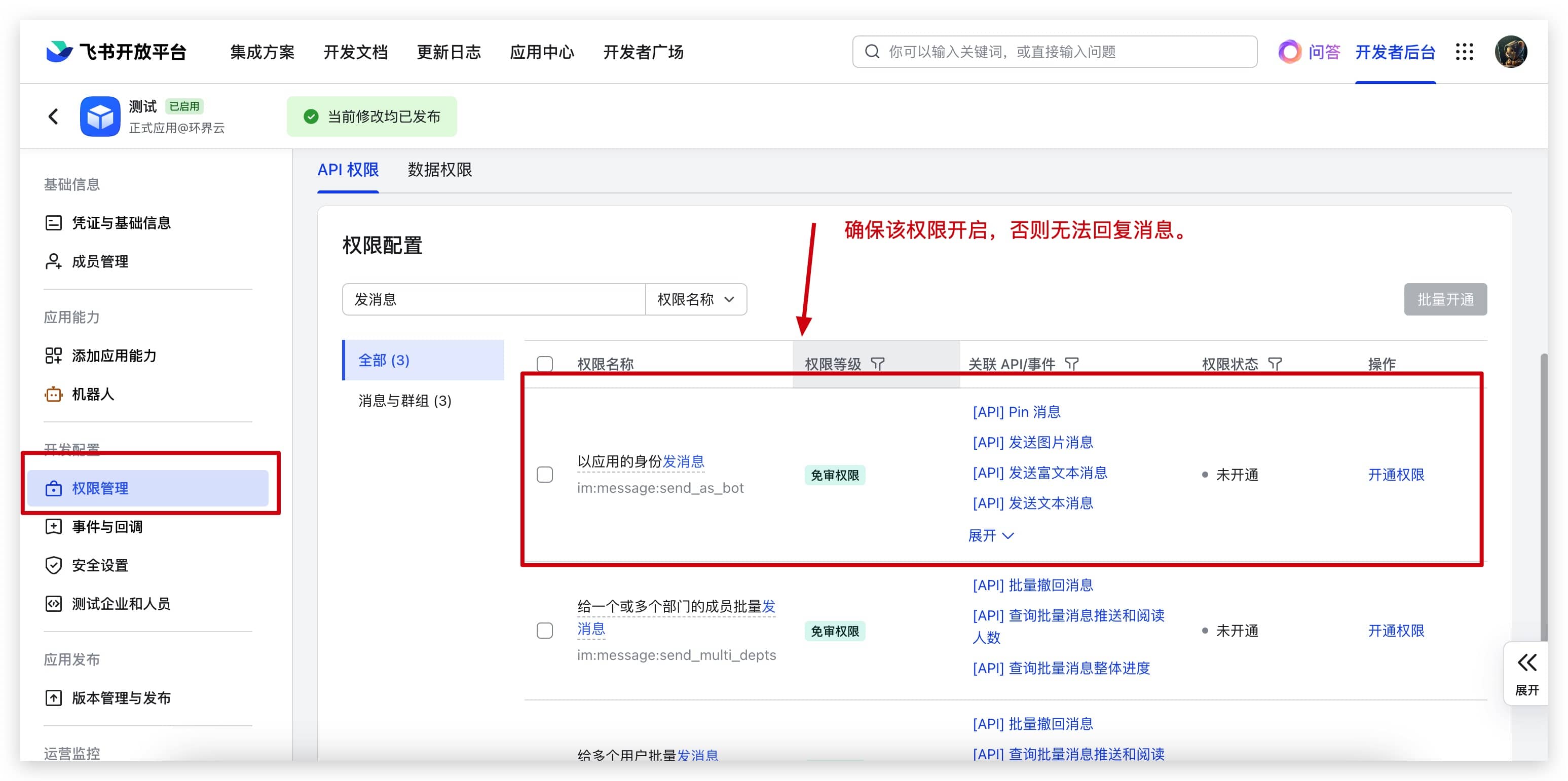 在飞书控制台,点击左侧的 权限管理 ,搜索框中输入发消息,找到以应用的身份发消息的权限,点击开通权限。